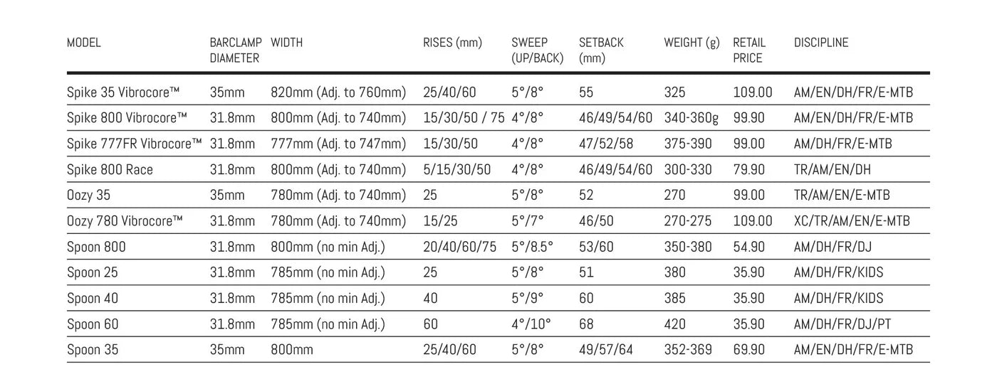 Use the chart below to assist in identifying the right SPANK INDUSTRIES Handlebar Model dor your riding style.