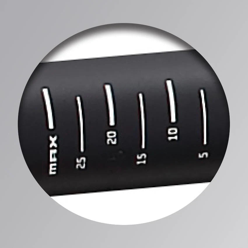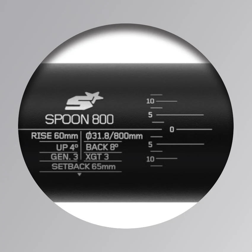 Located at the center, or bar clamp zone of the bar, this contains all the critical bar geometry specifications. The cockpit adjustment dial is a very handy reference for finding your ideal bar position.