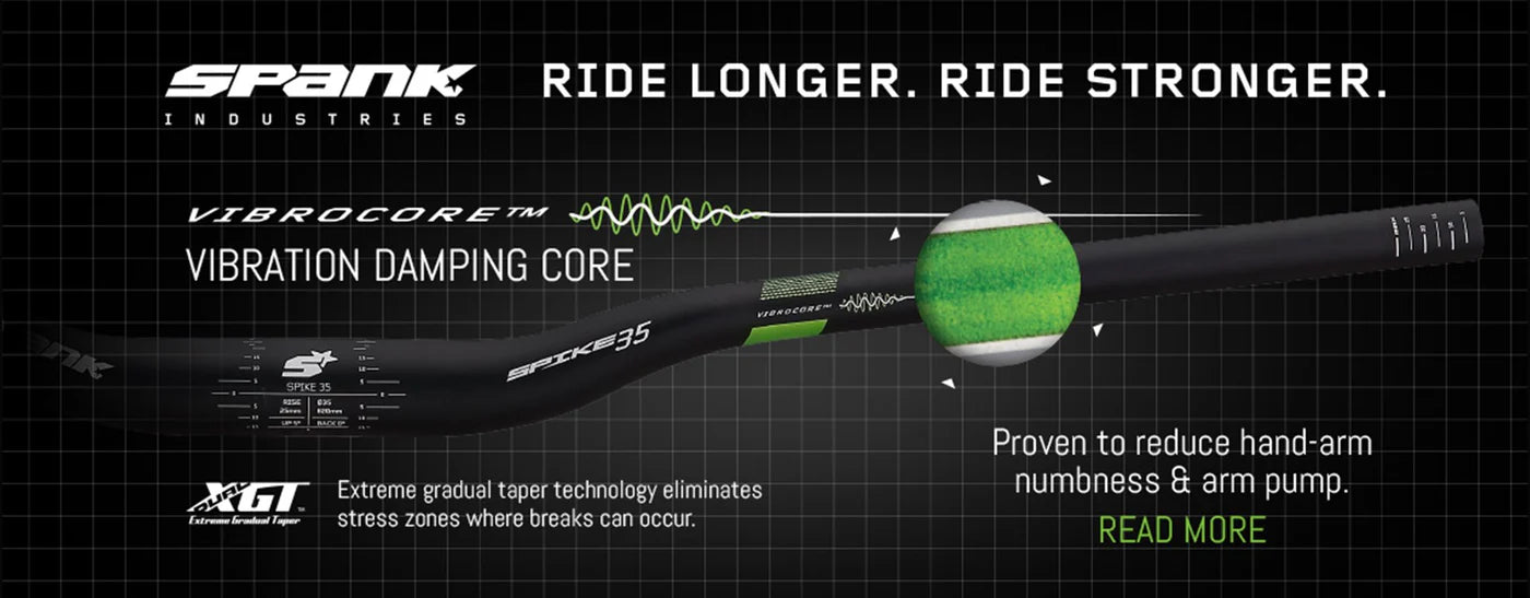 SPANK’S AWARD WINNING VIBROCORE™ TECHNOLOGY IS PROVEN TO REDUCE ARM-HARM NUMBESS AND REDUCE THE ONSET OF ARM-PUMP. In basic terms, the technology reduces the onset of fatigue and empowers you to spend more time in the saddle before your hands and arms give out!