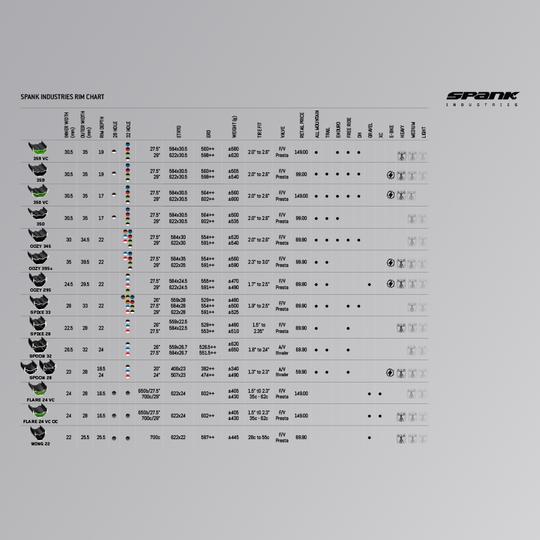 Download the pdf for a detailed chart of the specifications, ETRTO, ERD, weights and intended use / classification of SPANK Industries rims.